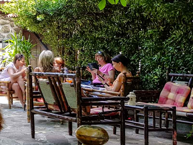 Wir vier suchten erst einmal etwas zum Sitzen und kehrten im „Retro-Kaffee” ein. Im Hof waren im Grünen etliche schattige Sitzmöglichkeiten. Unsere