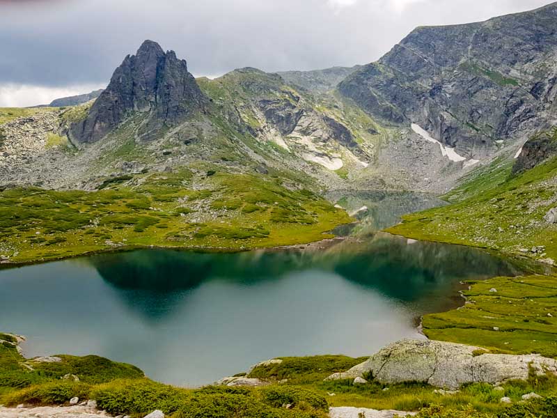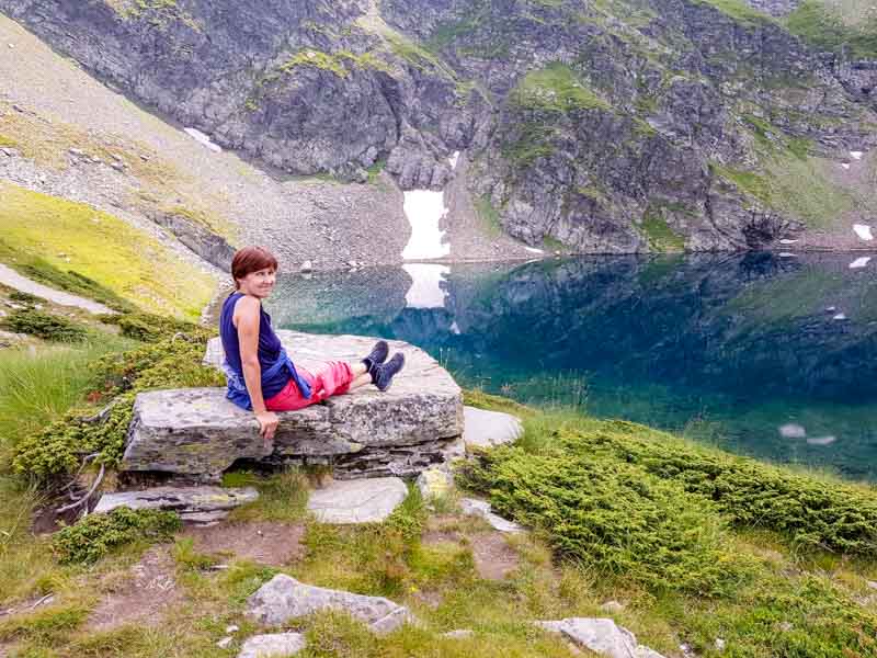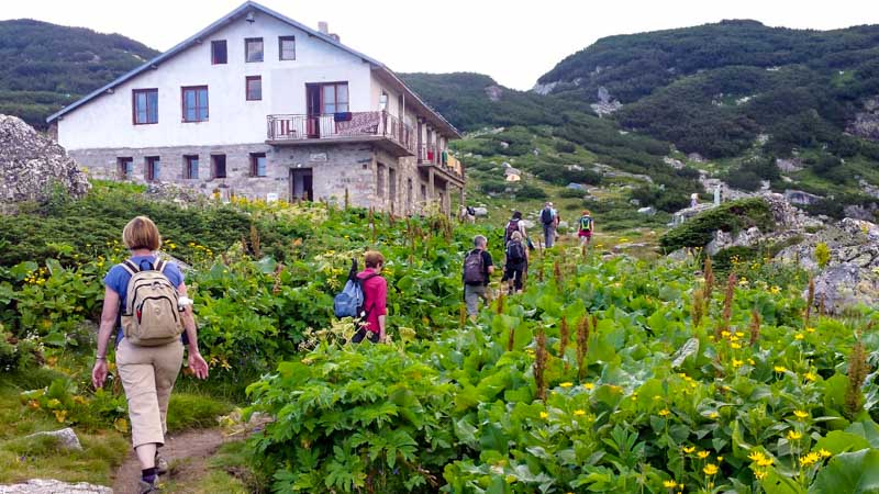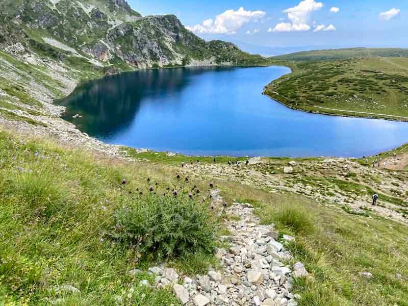 Nach besagter Busfahrt kamen wir an der Talstation des Sesselliftes an. Wir vier hatten uns heute für die kleine Variante der Tour entschieden. So durften wir 1000 Höhenmeter Unterschied mit einem offenen Zwei-Sitz-Sessellift in einer herrlichen 25-minütigen Auffahrt erleben. Bei traumhaftem Sommerwetter in wundervoller Landschaft schaukelten wir zur Bergstation der Rila-Seen-Hütte in 2150 m Höhe. Der andere Teil der Reisetruppe absolvierte diesen Aufstieg zu Fuß☹! Gute Leistung – mußte heute aber für uns nicht sein! Vom Lift ging es zu Fuß als erstes zum unteren See (erster See). Wir sollten heute sechs von den sieben Seen sehen.