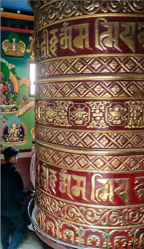 Jetzt sollte noch der größte Stupa weltweit Bodnath besucht werden. Er soll auch schon so 1600 Jahre alt sein und ist halt der größte. Ganz viele Wimpel und Gebetsmühle beeindruckten. Im Gegensatz zum ersten Stupa, das auch ein Aussichtspunkt ist, ist dieser Stupa eher ein zentraler Platz, umgeben von Geschäfts und Wohnhäusern, in deren Erdgeschossen sich die verschiedensten Läden befanden - Wechselstuben, Juweliere, Souvenirhändler und natürlich Restaurationen. Und mittendrin fand sich noch das Jamchen Lhakhang Kloster. Es ist dem Buddha der Zukunft Maitreya gewidmet und es gibt dort die größte Gebetsmühle, die ich jemals gesehen habe.